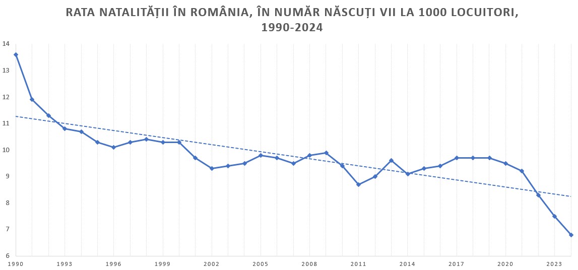 Rata natalității din România (8,4 născuți-vii la 1000 locuitori), se situează puțin peste media europeană (8,2 născuți-vii la 1000 locuitori). Țările europene cu cea mai mică rată a natalității au fost Italia (6,4 născuți-vii la 1000 locuitori), Spania (6,6 născuți-vii la 1000 locuitori) și Grecia (6,8 născuți-vii la 1000 locuitori).