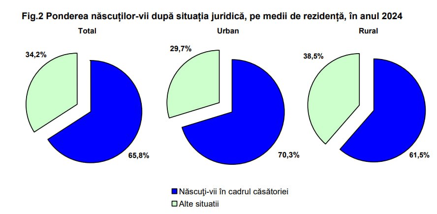 Puțin peste 1/3 din copiii României se nasc în afara căsătoriei; procentajul a crescut lent, dar continuu după 1989, când era circa 16-17 (deci a crescut cu 100%):
