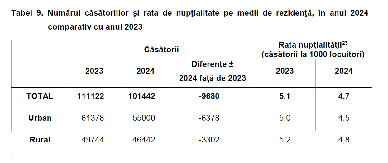 În anul 2024 s-au înregistrat 101442 căsătorii, cu 9680 căsătorii mai puține decât în anul anterior.