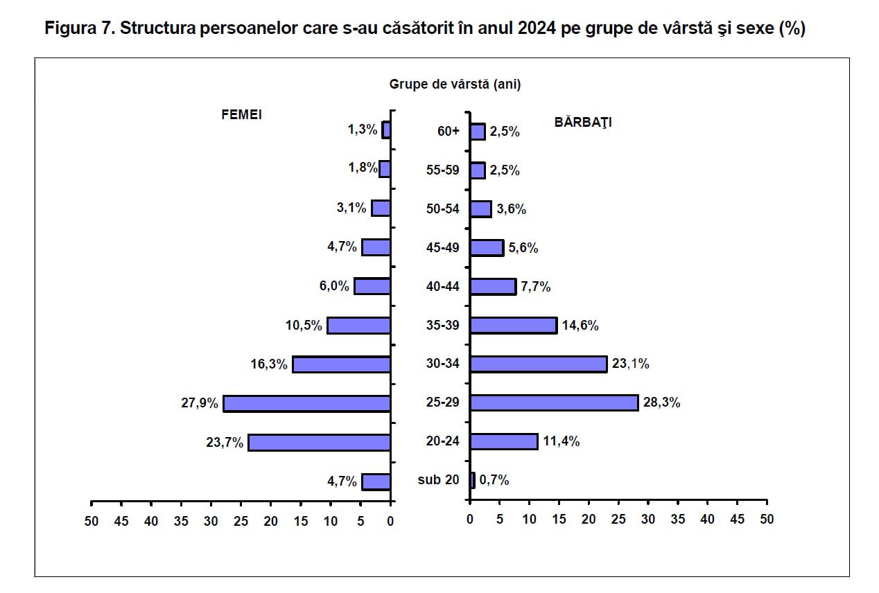 Structura căsătoriilor pe grupe de vârstă ale soților în anul 2024 evidențiază faptul că o parte semnificativă a tinerilor amână căsătoria după vârsta de 35 ani, 24639 căsătorii (24,3%) fiind încheiate între femei şi bărbaţi de 35 ani și peste (27,9% în mediul urban și 20,1% în mediul rural).