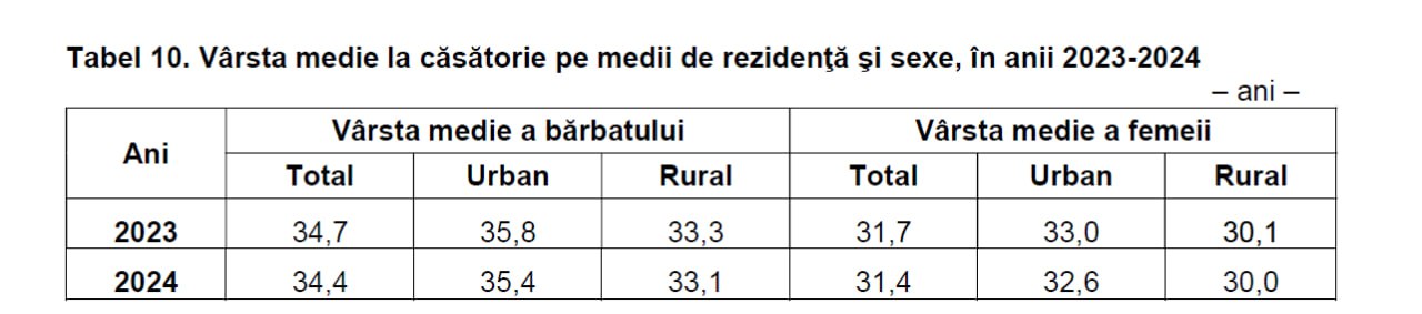 În anul 2024, vârsta medie la data căsătoriei a scăzut față de anul precedent, în medie cu 0,3 ani atât la femei cat si la bărbaţi. Astfel, vârsta medie la căsătorie, în anul 2024, a fost de 31,4 ani la femei şi de 34,4 ani la bărbaţi. Decalajul între vârsta medie a soţilor a continuat să rămână de 3,0 ani, aspect considerat favorabil din punct de vedere al condiţiilor necesare asigurării procreării.