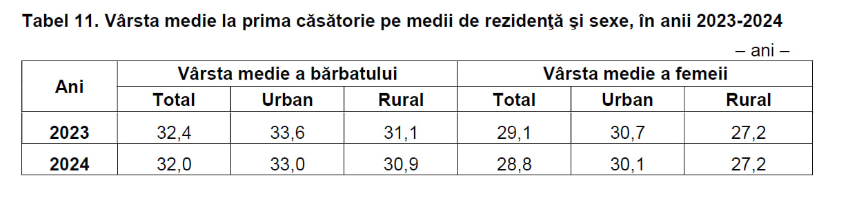 În anul 2024, vârsta medie la prima căsătorie a fost de 32,0 ani pentru bărbați și de 28,8 ani pentru femei, în scădere faţă de anul 2023 cu 0,4 ani la bărbaţi şi cu 0,3 ani la femei. În anul 2024 se menţine tendinţa de deplasare a acestor indicatori spre limite de vârstă mai înaintată (după 28 ani pentru femei, respectiv după 32 ani pentru bărbaţi). Pe termen lung, acest fenomen este de natură să influenţeze negativ natalitatea, ca efect al reducerii perioadei fertile a persoanelor.