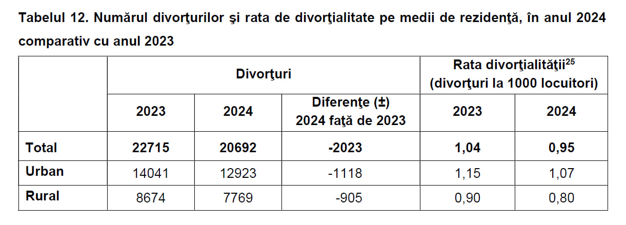 În anul 2024 numărul divorţurilor* pronunţate prin hotărâri judecătoreşti definitive și prin acordul soților (pe cale administrativă sau prin procedură notarială) a fost de 20692, în scădere cu 2023 divorţuri comparativ cu anul 2023. Rata divorţialităţii a scăzut de la 1,04 divorţuri la 1000 locuitori în anul 2023, la 0,95 divorţuri la 1000 locuitori în anul 2024.