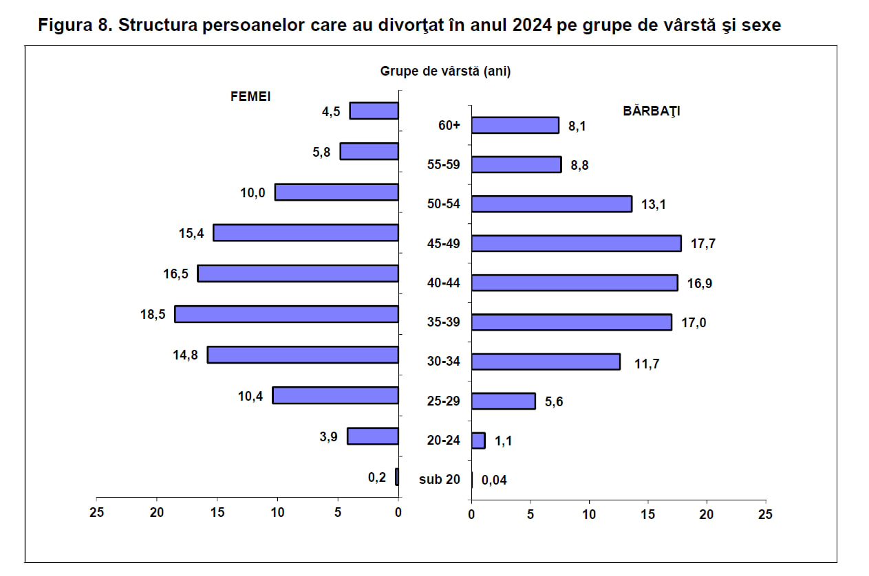• începând cu vârsta de 50 de ani, numărul bărbaţilor care au divorţat crește semnificativ față de cel al femeilor: de 1,3 ori la grupa de vârstă 50-54 ani, de 1,5 ori la grupa de vârstă 55-59 ani şi de 1,8 ori la grupa de vârstă 60 ani şi peste.