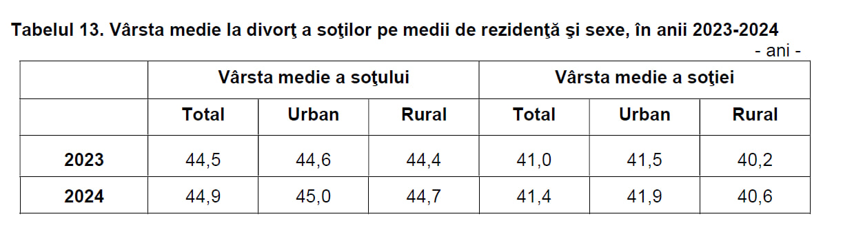Vârsta medie a soţilor la divorţ a fost de 44,9 ani pentru bărbaţi şi de 41,4 ani pentru femei.