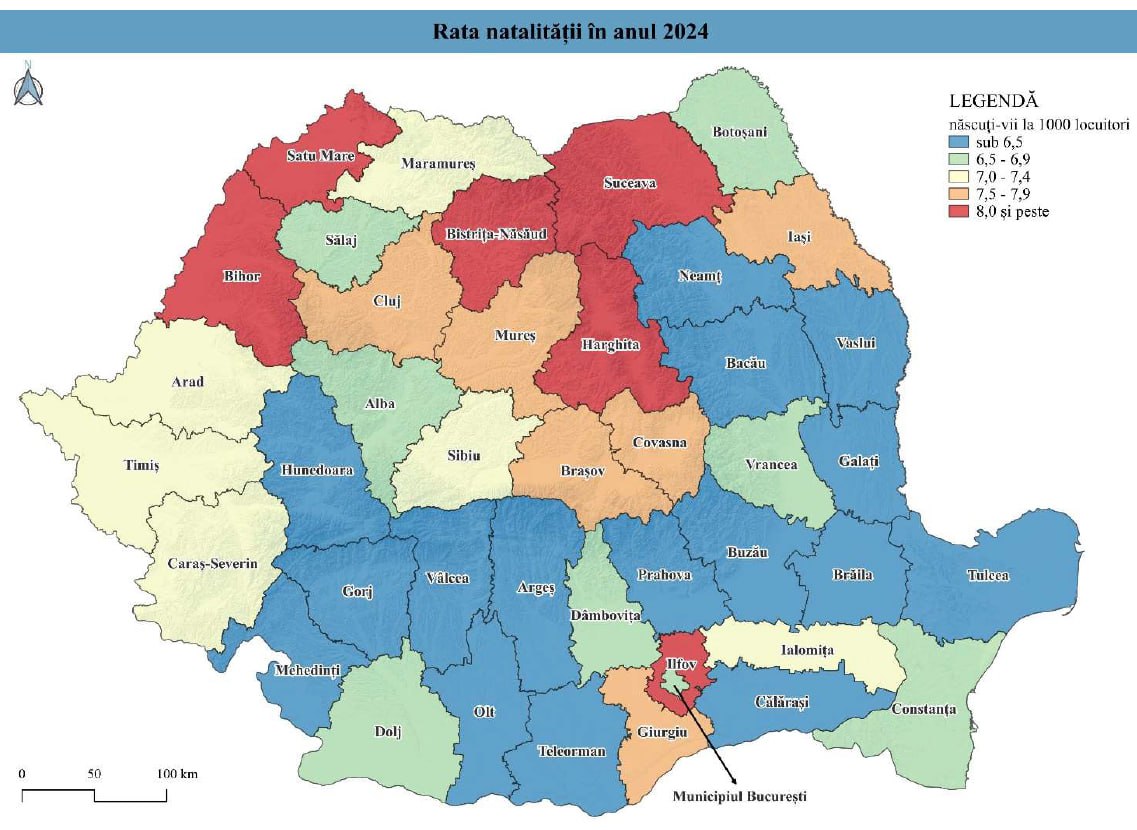 Cea mai ridicată rată a natalității s-a înregistrat în județele din NV țării și din N Moldovei, iar cea mai redusă, în S Moldovei și Oltenia: