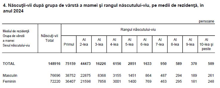 Ponderea născuților-vii de rangul I („primul copil”) cu reședința în România a fost de 48,6%, născuții-vii de rangul II au reprezentat 31,0%, iar a celor de rangul III a fost de 11,3%.