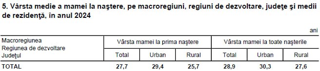 Vârsta medie a mamei la naştere, în anul 2024, a fost de 27,7 ani.